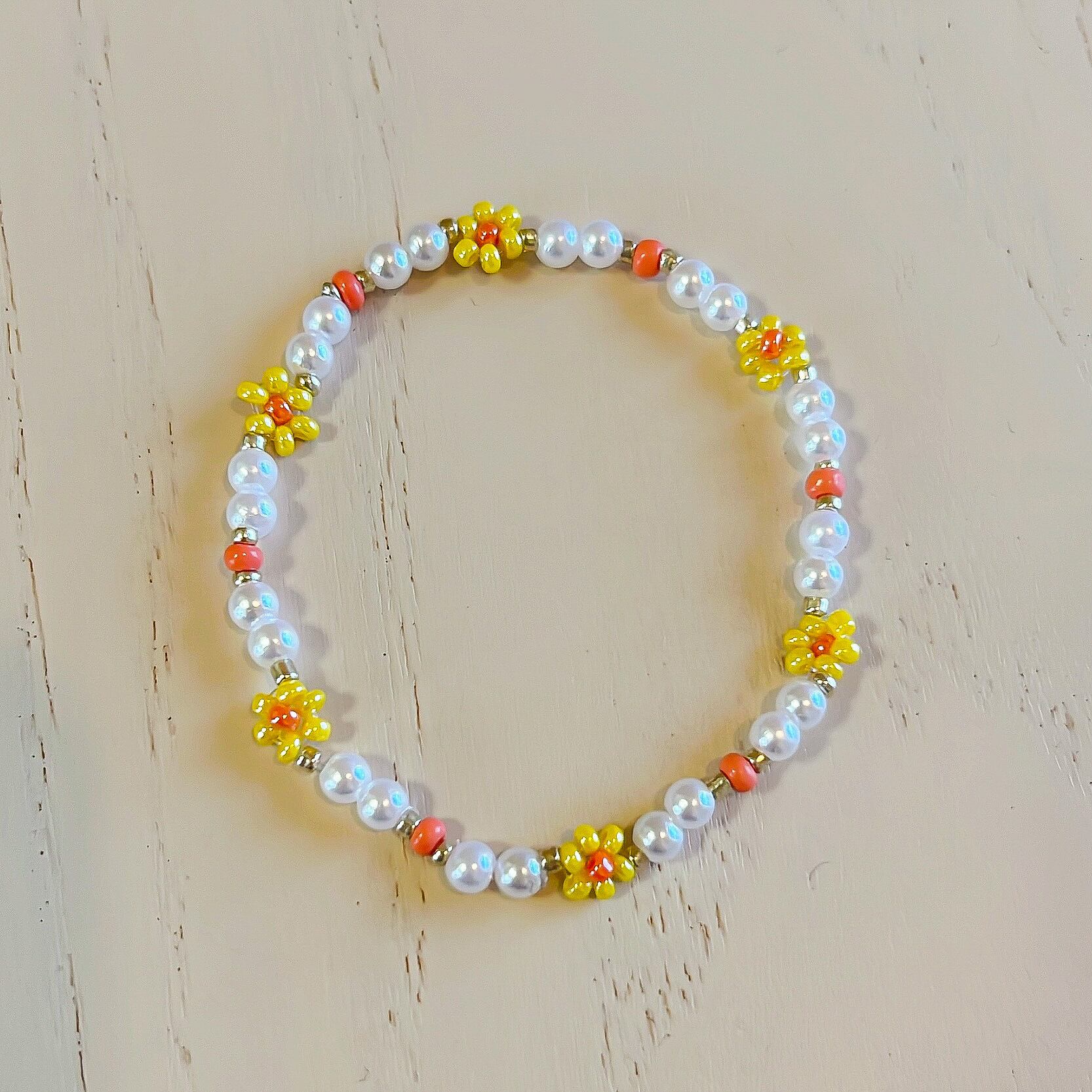 鮮やかな黄色とオレンジの可愛らしいお花を小粒のパールでまとめました。コーディネートのアクセントとなり視線を集める華やかな印象の作品です。