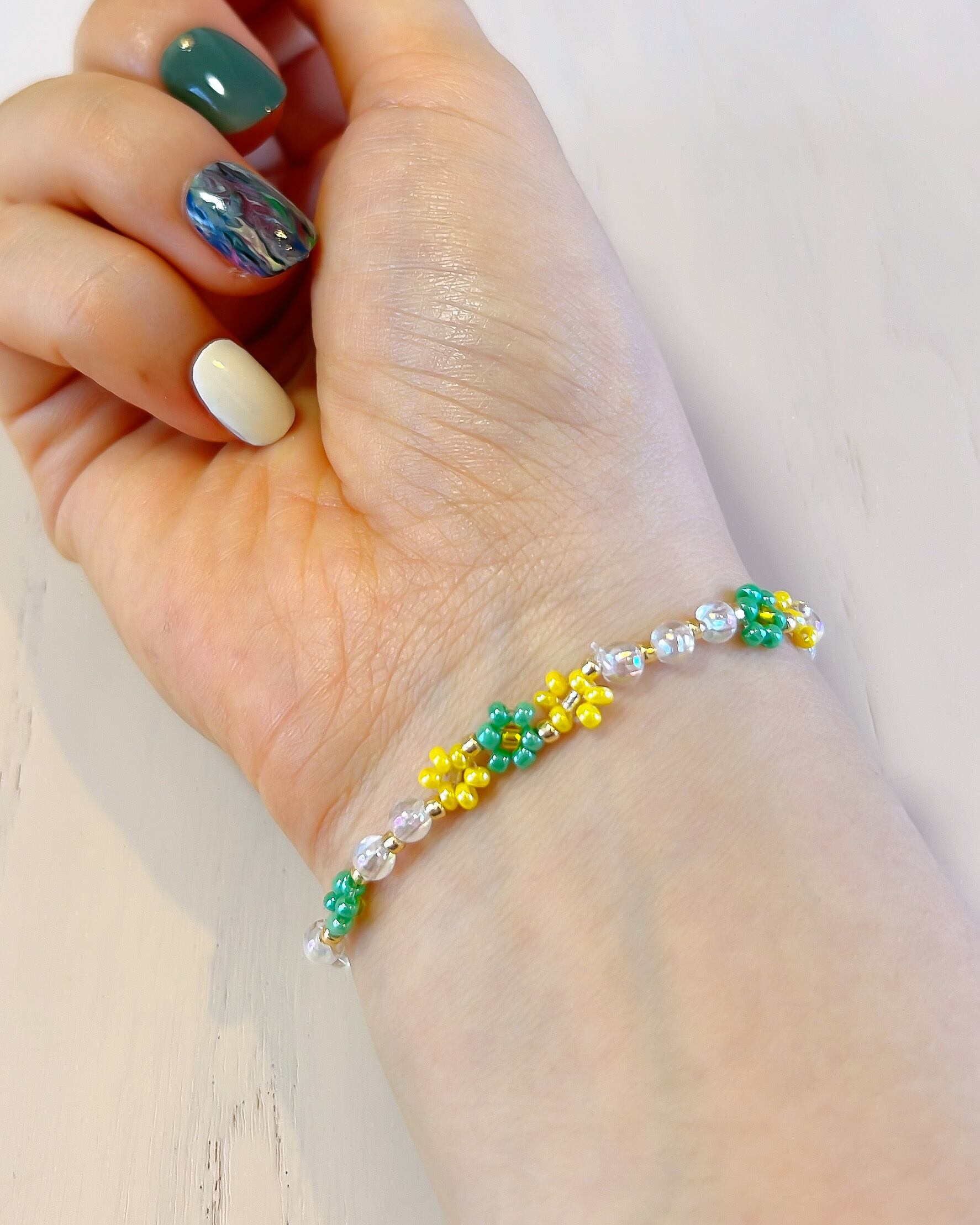 艶感のある鮮やかな黄色と緑のお花を散りばめ、オーロラのような偏光が特徴の透明なビーズでまとめた、個性的で可愛らしい作品です。