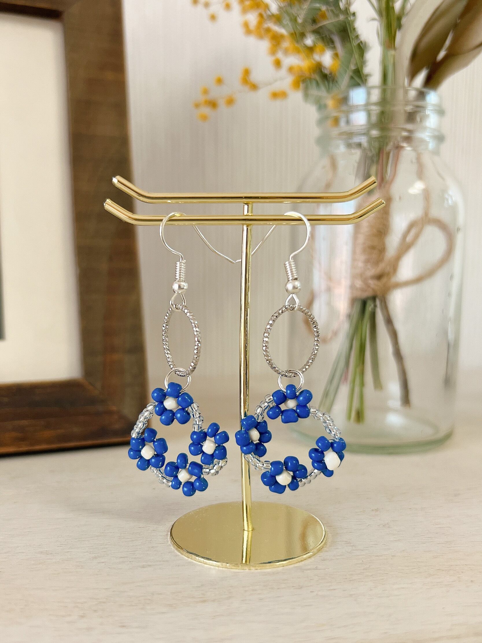 ぱっと目を引く鮮やかなブルーのお花にきらきら光るシルバーのリングを組み合わせた、耳元を華やかに彩る作品です。